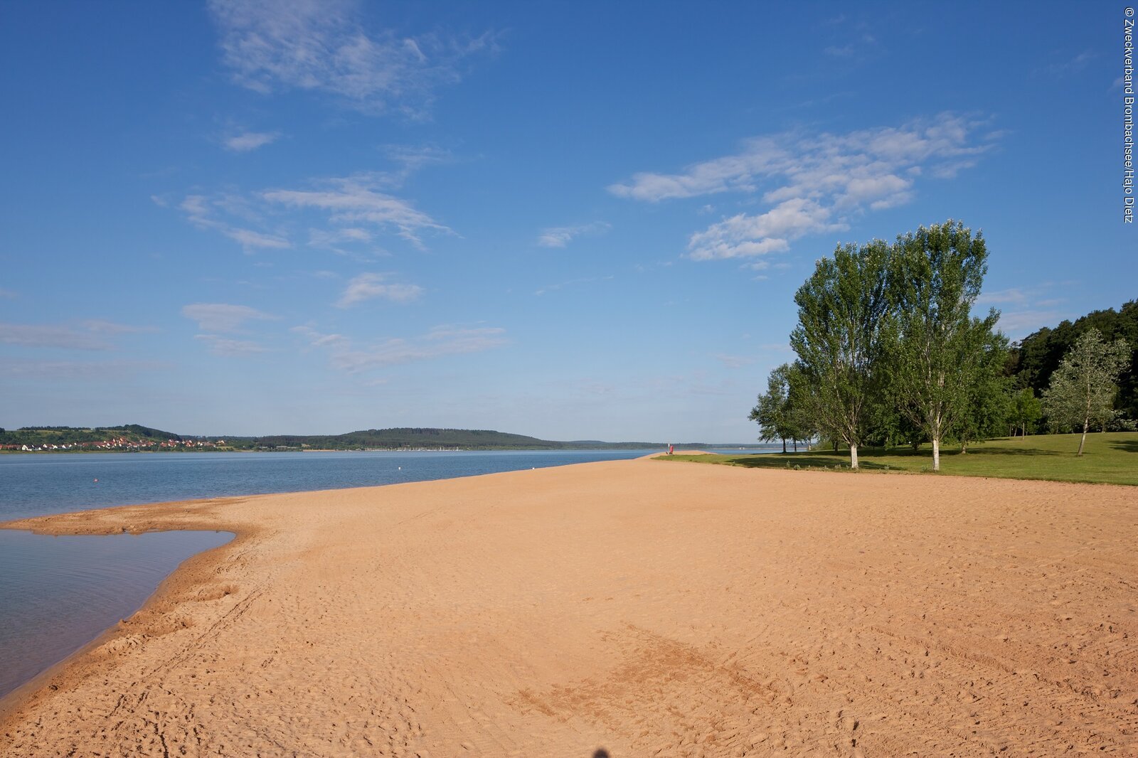 Am Nordufer des Großen Brombachsees wartet der Allmannsdorfer Sandstrand auf Badegäste.