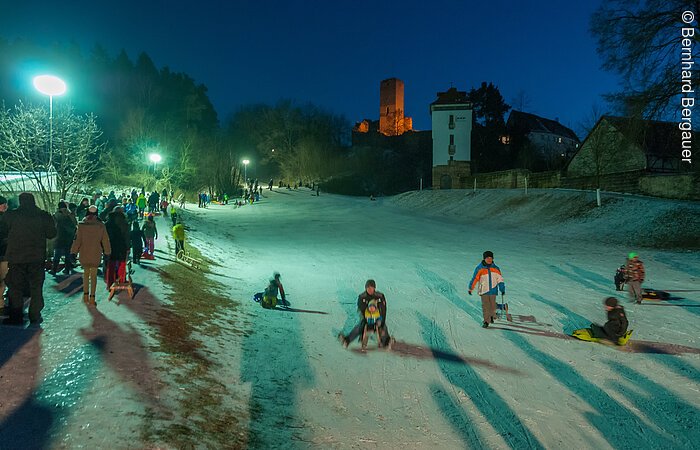 Rodeln am Schloßbuck ist immer wieder ein Erlebnis. Unterhalb der Burg Hilpoltstein befindet sich der Schlittenhang mit einer Naturrodelbahn, auf dem sich Jung und Alt dem Wintervergnügen widmen können. Das alljährliche Nachtrodeln des THW Hilpoltstein findet immer großen Anklang.