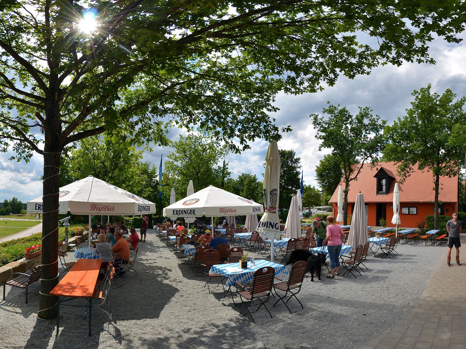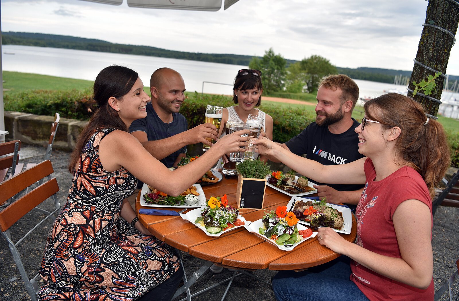 Der perfekte Ausgangspunkt, Zwischenstopp oder Abschluss eines Tages auf der Badehalbinsel Absberg? Der Biergarten "Zum Hafen!" Direkt am Radweg und mit Nähe zum Hundestrand, Segelhafen, Fahrradverleih und Surfschule gelegen, punktet das Freiluft-Restaurant mit gigantischem Seeblick (am schönsten von der Hochterrasse mit großem Sonnensegel) und leckerem Essen - frisch, fränkisch, saisonal. Ob draußen oder im gemütlichen Jägerstüberl: die Karte bietet u.a. Herzhaftes, Deftiges vom Grill, gesunde Salate, vegetarische Gerichte, Kaffee und Kuchen. Unbedingt probieren: frischen Fisch und köstliche Wildspezialitäten.