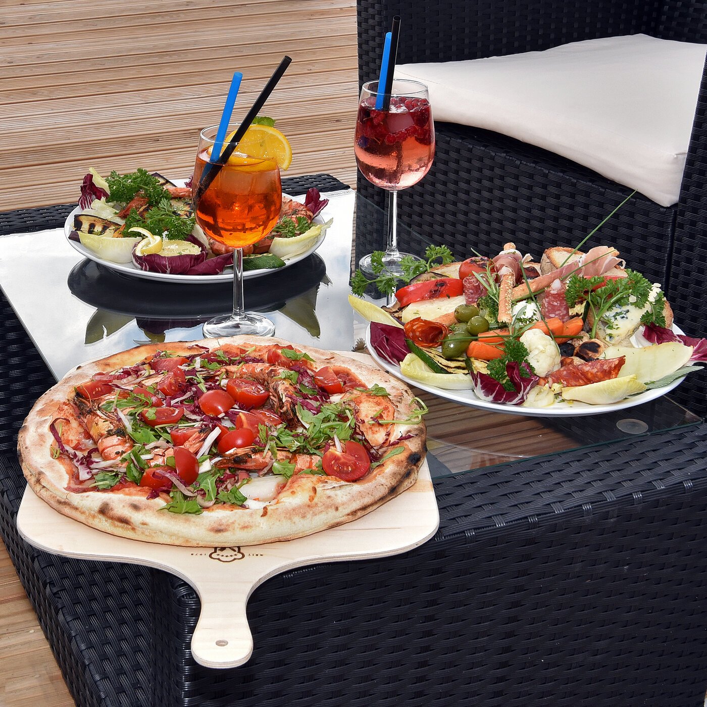 Ein Blick von der Sonnenterrasse des Sand & Sofa Allmannsdorf - und man ist raus aus der Enge des Alltags. Gleich neben dem größten Strand und am Hauptdamm des Großen Brombachsees gelegen, kann man hier bei traumhafter Aussicht ganz entspannt die mediterrane Küche genießen. Bequem: Die Anlegestelle der "MS Brombachsee" liegt direkt vor der Tür, Kinder können sich auf dem großen Spielplatz nebenan austoben.