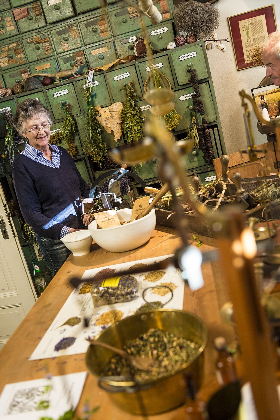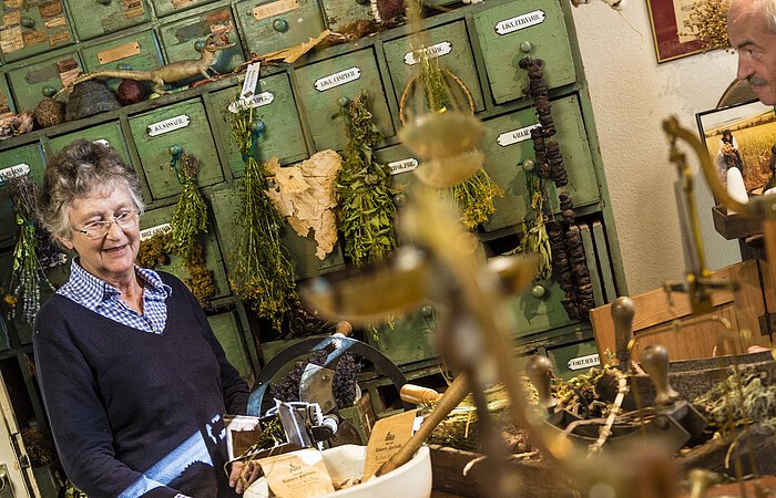 In der „Historischen Material- und Kräuterkammer“, strömt aus Schränken der Geruch von getrockneten Heilkräutern und Gewürzen. Mineralien, Harze, Kräuterhackbrett, Häckselmaschine, Mörser u. a. zeigen die Verarbeitung der Heilpflanzen. Ein besonders wertvolles Stück stellt das Manual (Rezeptbündel) aus dem späten 19. Jh. dar, in dem unterschiedlichste Rezepturen zusammengefasst sind. Daneben gibt es Erläuterungen zum berühmten Einhornpulver, das angeblich gegen jede Krankheit half.
