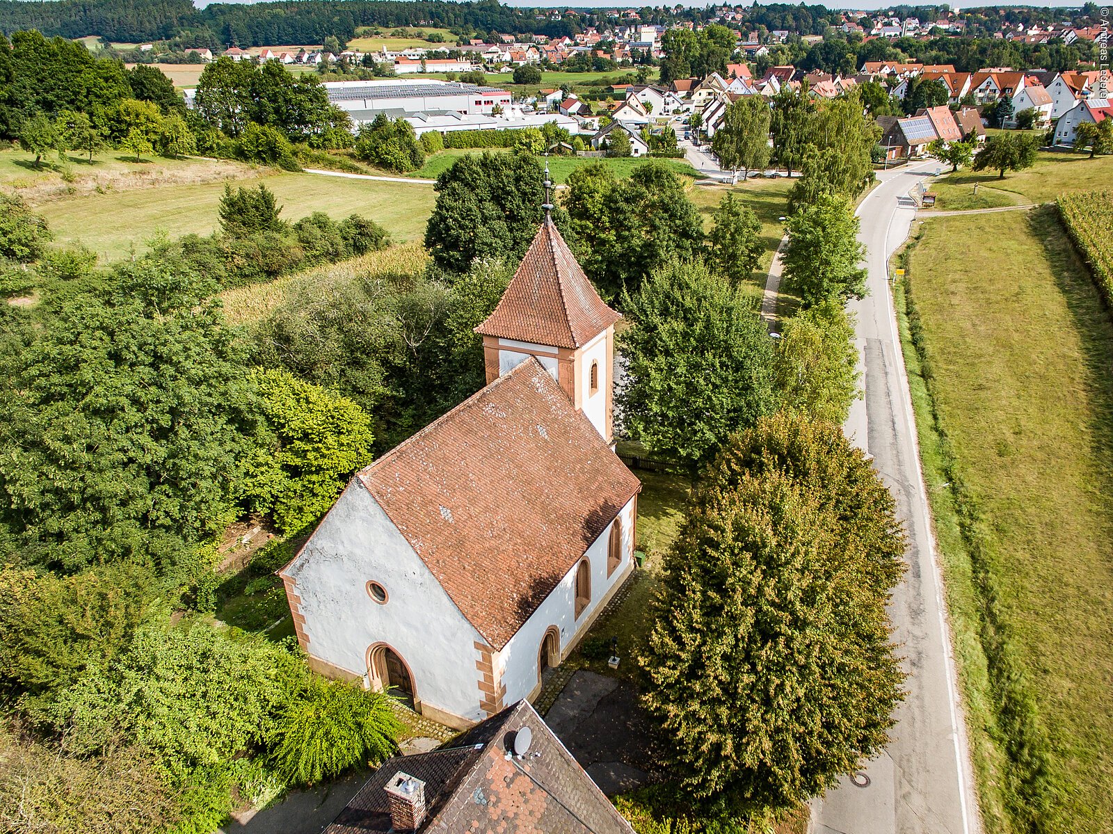 Im 14. Jahrhundert hat hier bereits eine Kapelle gestanden. 1400 wurde von Amtmann, Ritter von Hellberg, ein Kirchenschiff an den ursprünglichen Turm angebaut. Dieses Bauwerk, sowie einige Marterln bis zum Studienheim sollten Dankopfer für seine Genesung nach einer Kreuzfahrt nach Jerusalem sein. Das war in damaliger Zeit durchaus üblich. Die Fresken im Kirchenschiff wurden etwa 50 Jahre später als "Bilderbibel" gemalt und erst Anfang des 20. Jahrhunderts bei Anstricharbeiten wieder freigelegt.