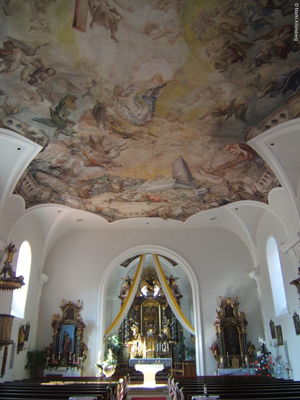 Errichtet 1708 bis 1710 anstelle der baufälligen Spitalkirche am "Neuen Markt". In der barocken Kirche befindet sich eines der größten Deckengemälde in der Diözese Eichstätt mit der Darstellung "Mariä Himmelfahrt". Acht Gräber hoch gestellter Persönlichkeiten von Allersberg, unter anderem das Grab der Sybilla Maurer, der Retterin des Allersberger Drahtzuges.