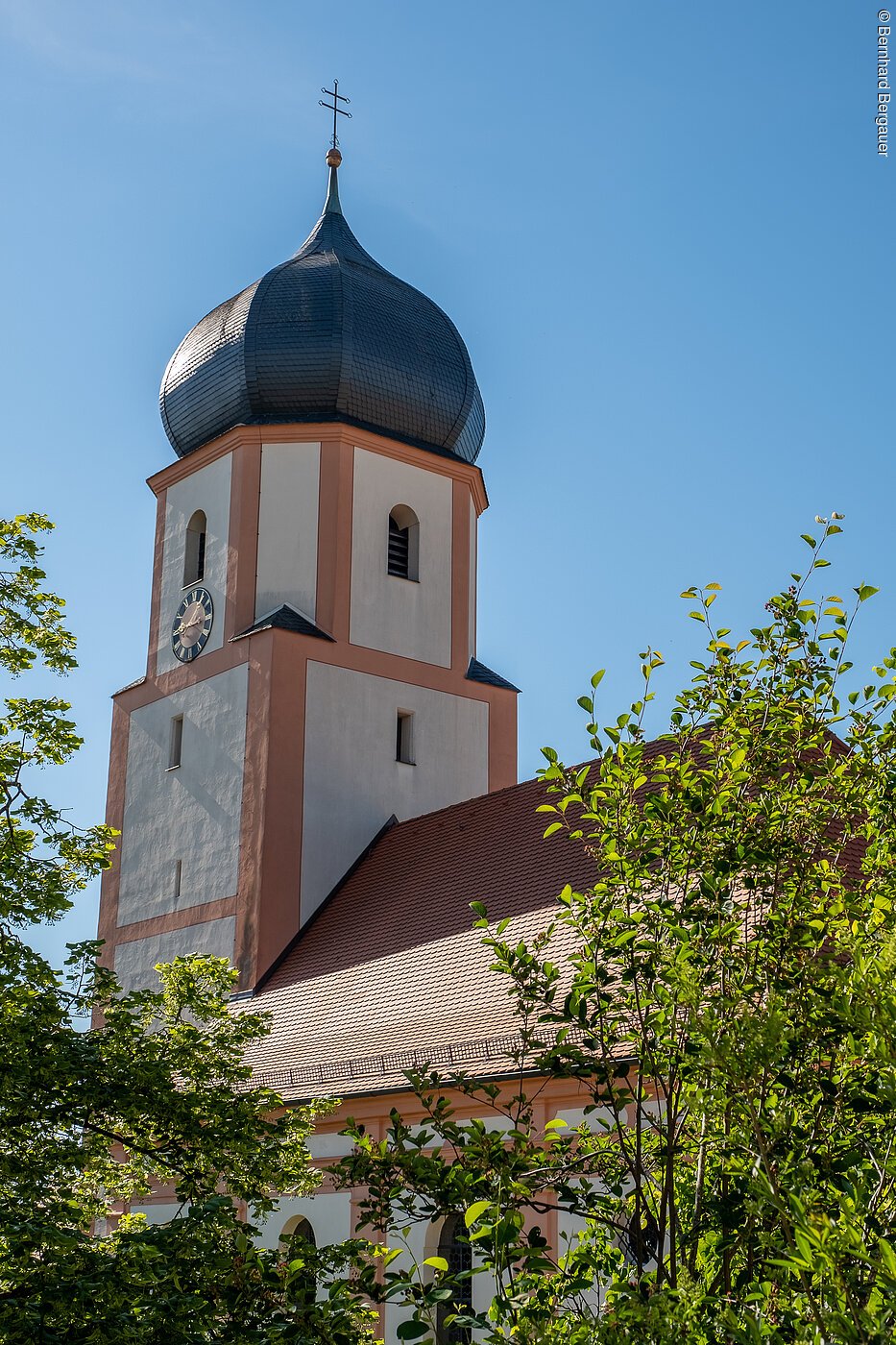 Putzbau mit Pilastergliederung, Walmdach und Chorturm mit Zwiebelhaube, flachgedecktes Langhaus mit Stichkappen und eingezogener Chor mit Kreuzgewölbe, barock, Turm im Unterbau mittelalterlich, Langhaus und Turmobergeschoss von Johann Puchtler, 1729