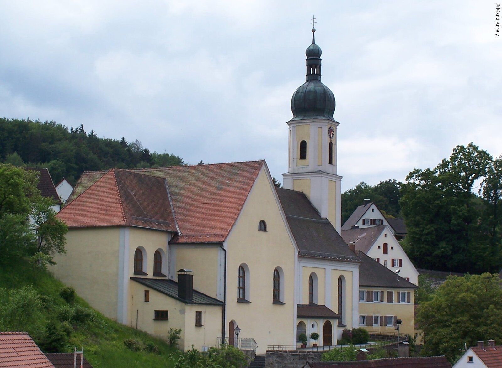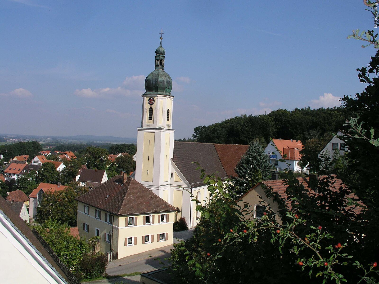 Hoch ragt die Pfarrkirche St. Blasius in der Ortsmitte von Arberg empor. Sie entstand 1709/10 anstelle eines bereits beachtlich großen Vorgängerbaus und erhielt bei einem Umbau 1937 ihr heutiges Aussehen.