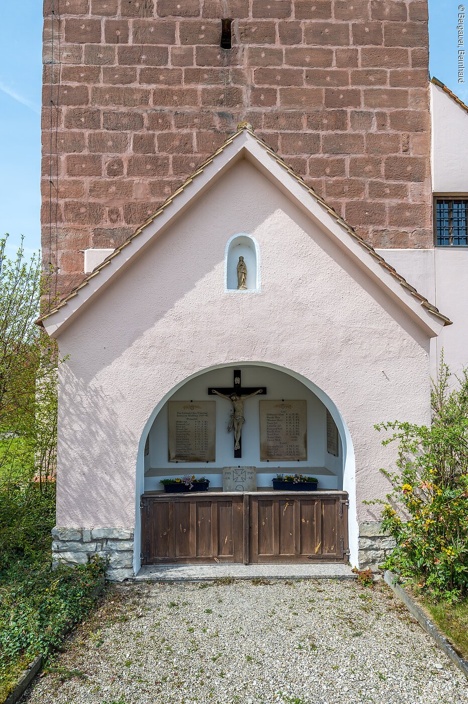 Teilweise verputzter Sandsteinquaderbau mit Walmdach und Chorturm mit Spitzhelm, flachgedecktes Langhaus mit Bandelwerkstuckaturen und eingezogener Chor mit Kreuzrippengewölbe, im Kern frühes 15. Jahrhundert, nach 1758 erweitert und barockisiert