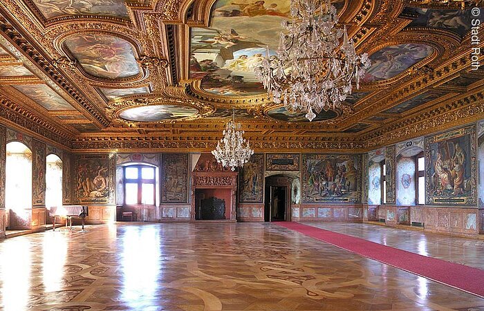Der Museumsrundgang beginnt mit den historischen Räumen. Von besonderer Bedeutung sind hier Treppenhaus, Kaminzimmer, Musikzimmer, Barockzimmer, Speisesaal und der 15 x 23 Meter große Prunksaal im Stil der italienischen Renaissance.