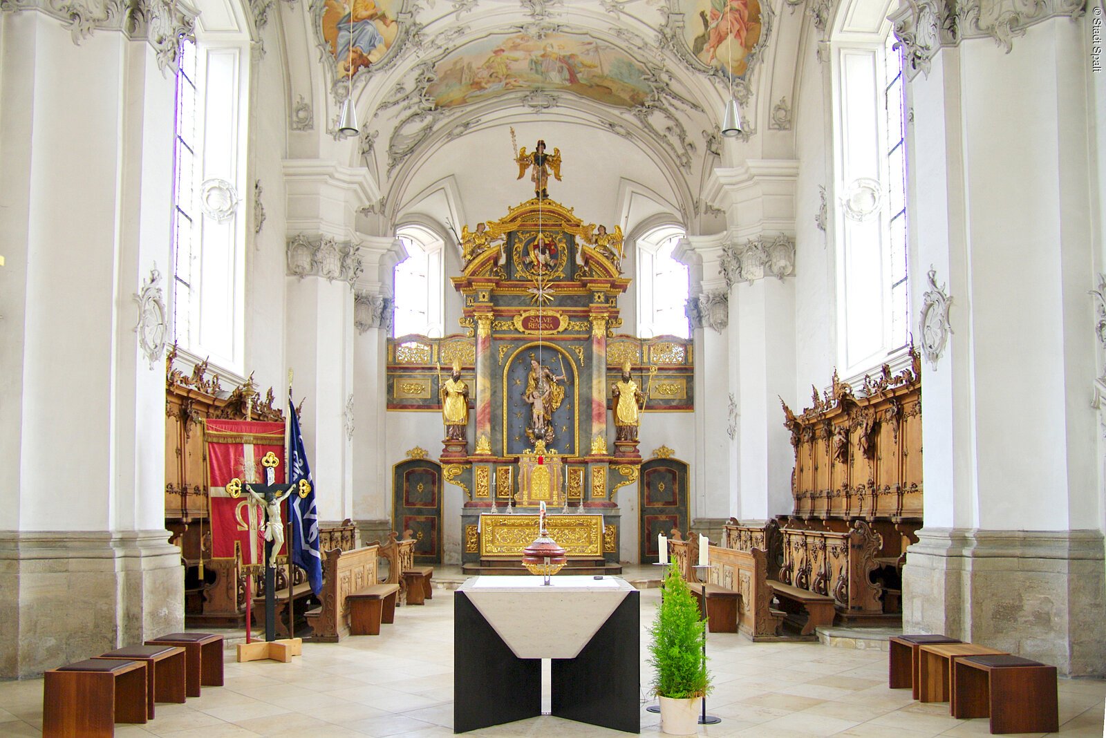 Stiftskirche St. Nikolaus, erbaut 1302 bis 1313, Begräbnisstätte des Nürnberger Burggrafen Konrad ll. (der Fromme), verstorben 1314, und seiner Gemahlin Agnes von Hohenlohe (1319 verstorben). Schöne Deckenfresken, die die vielseitige Wirksamkeit des heiligen Nikolaus darstellen. Neubau von 1767 bis 1773.
