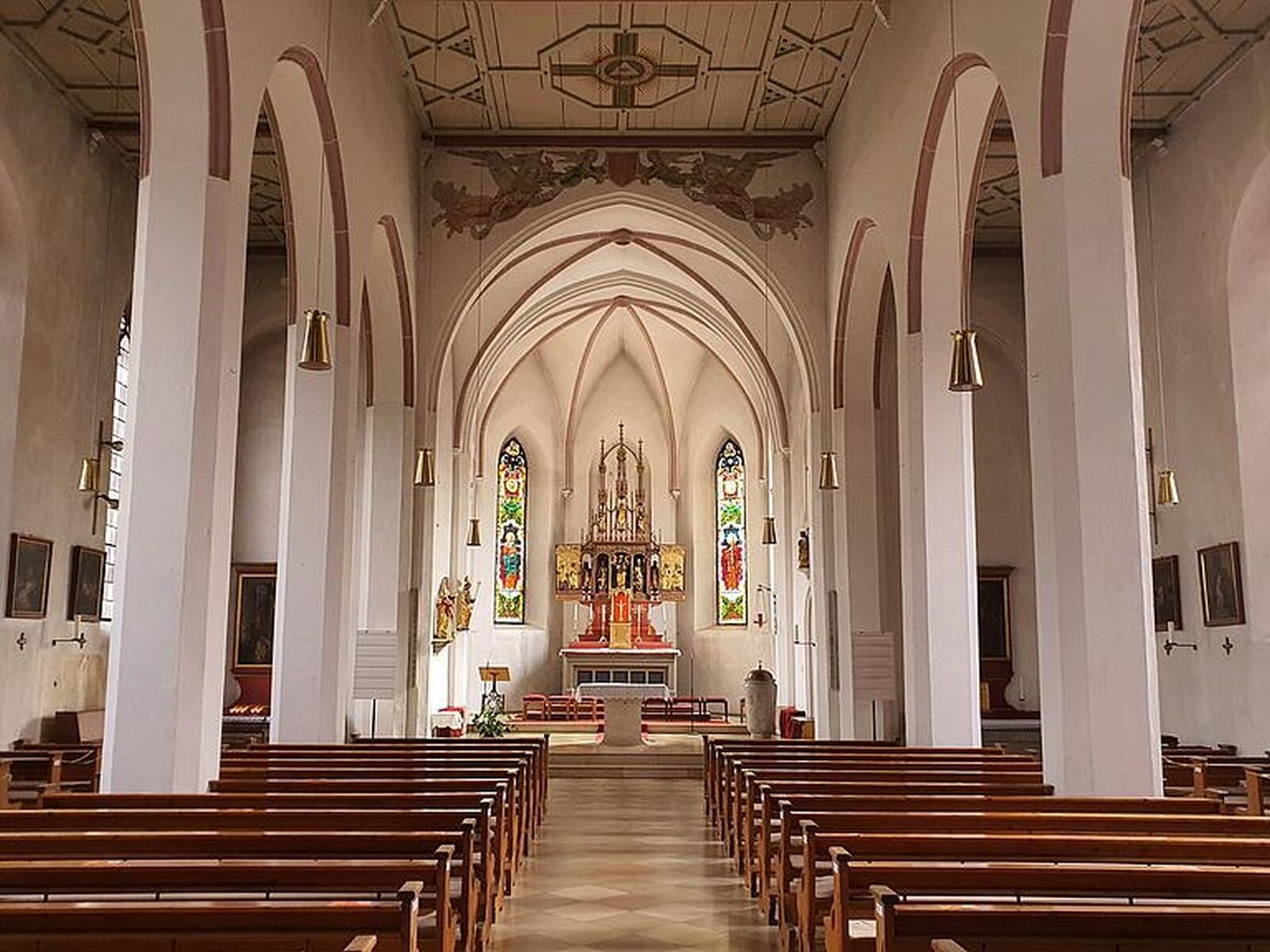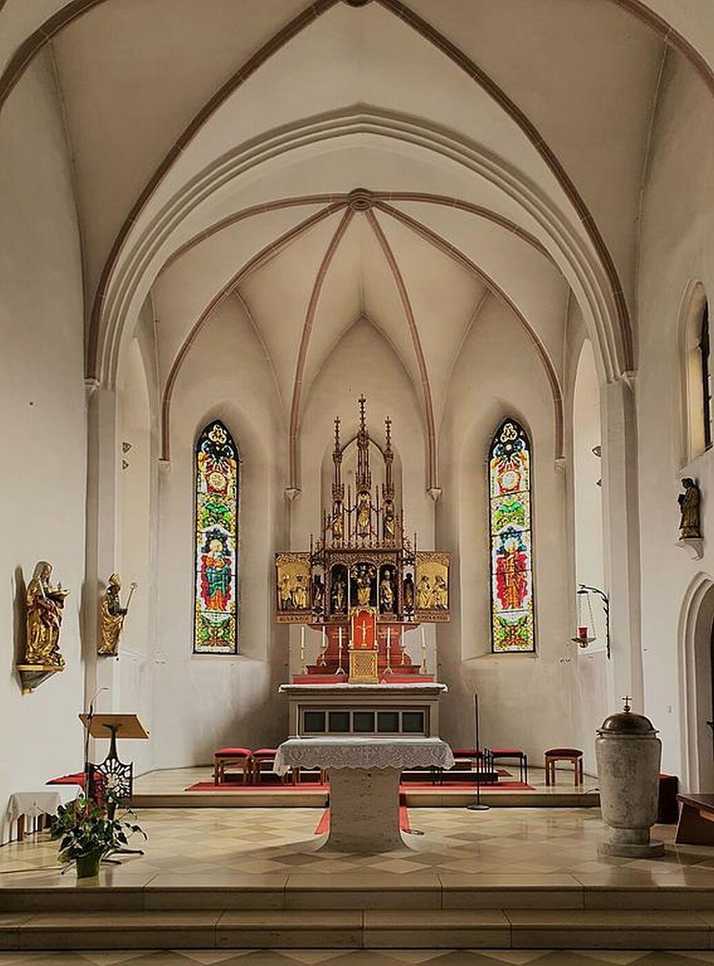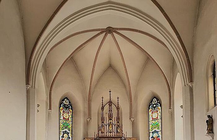 Der neugotische Hauptaltar wurde wahrscheinlich von einem gewissen Meister Weiß aus Landshut gefertigt. Das Bild des Hauptaltares - die Kreuzigung Christi - war die letzte Arbeit des verstorbenen Professors Schlotthauer aus München. Die beiden Seiten des Altares zierten die Statuen von Willibald und Walburga. An den Wandflächen oberhalb des Eingangs zum Presbyterium befanden sich die Bildnisse der Apostel Petrus und Paulus. Die Bilder der beiden Seitenaltäre stellen die Krönung Mariens und die Heilige Familie (Anna Selbdritt) dar und sind etwa um 1510 entstanden.