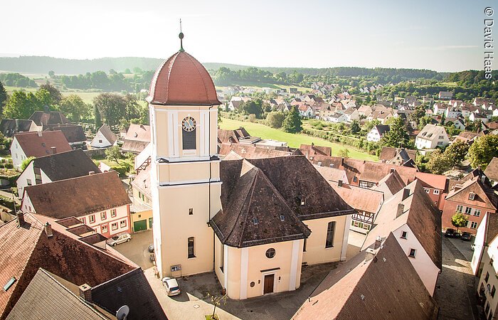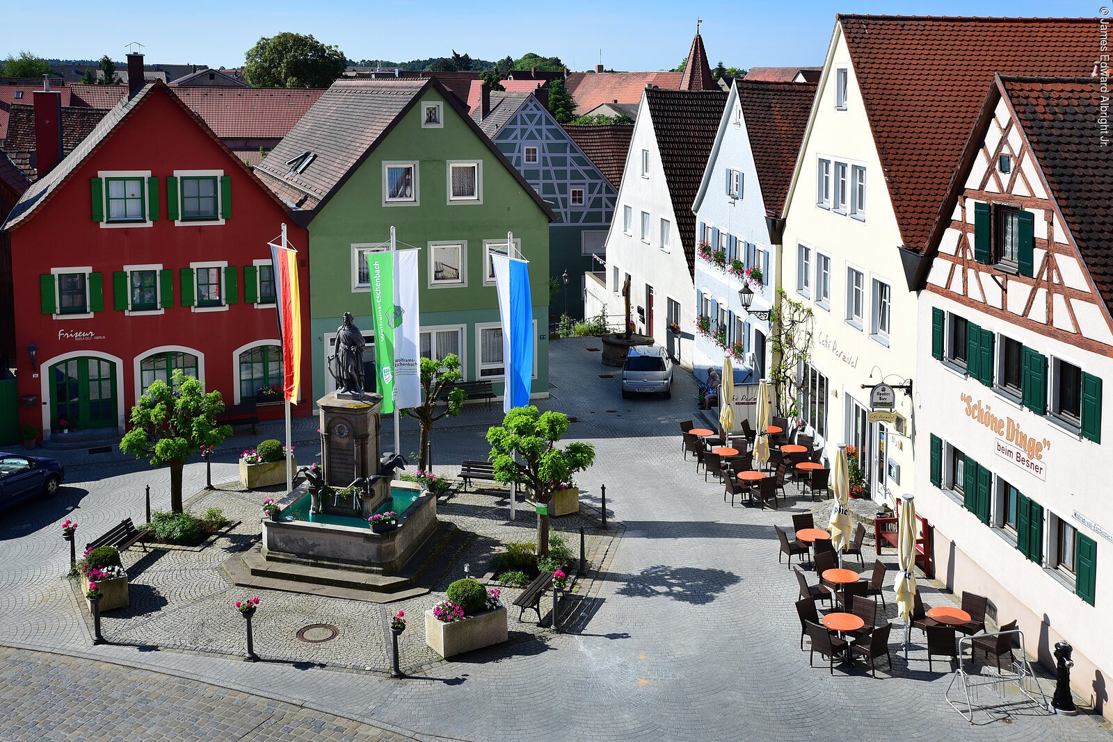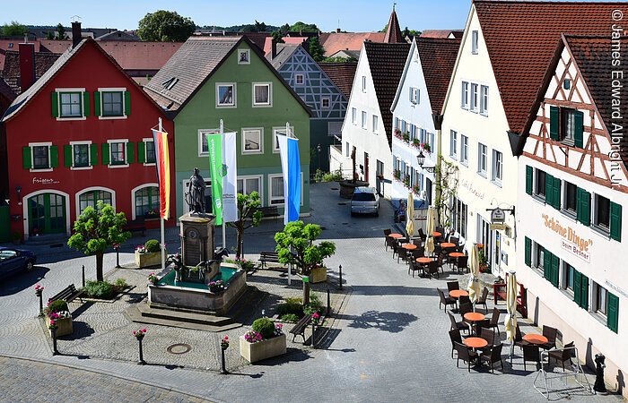 Wolframs-Eschenbach begrüßt die Radler zurück im Fränkischen Seenland. Die Heimat des Minnesängers Wolfram von Eschenbach hat ihm und seinem Werk ein Museum gewidmet. Hinter der Stadtmauer entdeckt man hier prächtige Fachwerkhäuser. Nach der Stadtdurchfahrt umrundet der Radweg den Schießweiher. Anschließend geht es wieder in nördlicher Richtung über die Dörfer Reutern und Sauernheim zurück an die Fränkische Rezat. Nun nähern die Radler sich der Stadt Windsbach. Die Heimat des Windsbacher Knabenchors war früher ein wichtiger Verkehrsknotenpunkt, wovon heute die aus Sandsteinquadern erbaute Markgrafenbrücke zeugt. Neben historischen Bauten wie dem Stadtturm findet man in Windsbach auch ein denkmalgeschütztes Naturfreibad mit außergewöhnlichem 100-Meter-Becken. Die Fränkische Rezat befindet sich jetzt rechts von den Radlern. Sie folgen ihrem Lauf über Retzendorf und Wassermungenau bis nach