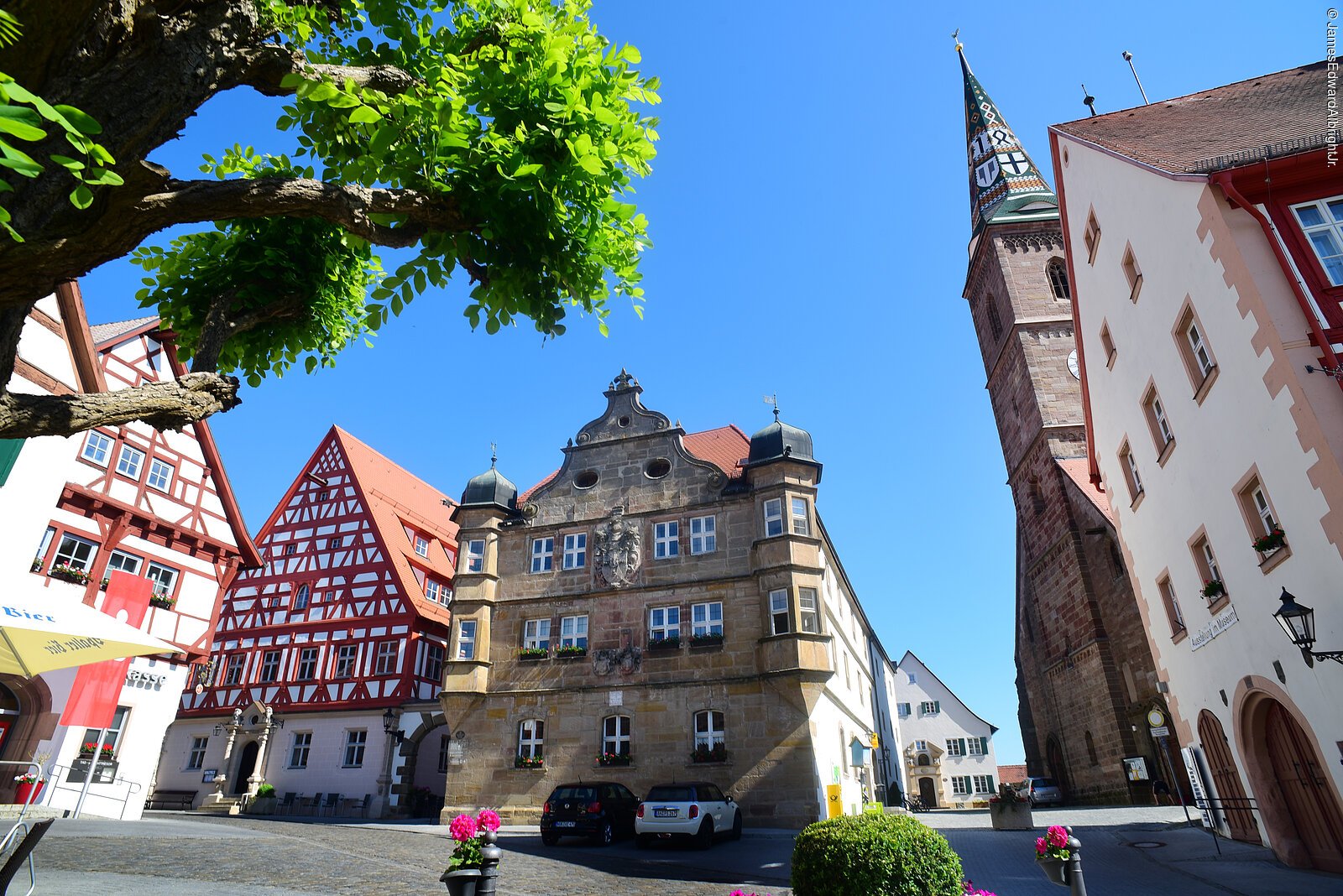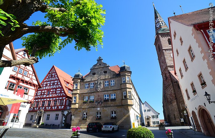 Waldstücken nach Wolframs-Eschenbach, in die Geburtsstadt des bekannten Minnesängers Wolfram von Eschenbach. Entlang der Hauptstraße reihen sich aufwendige Fachwerkhäuser. Das Rathaus – die ehemalige Komturei des Deutschen Ordens – beeindruckt mit seiner Renaissancefassade und das Münster ist eine der frühesten Hallenkirchen in Deutschland.