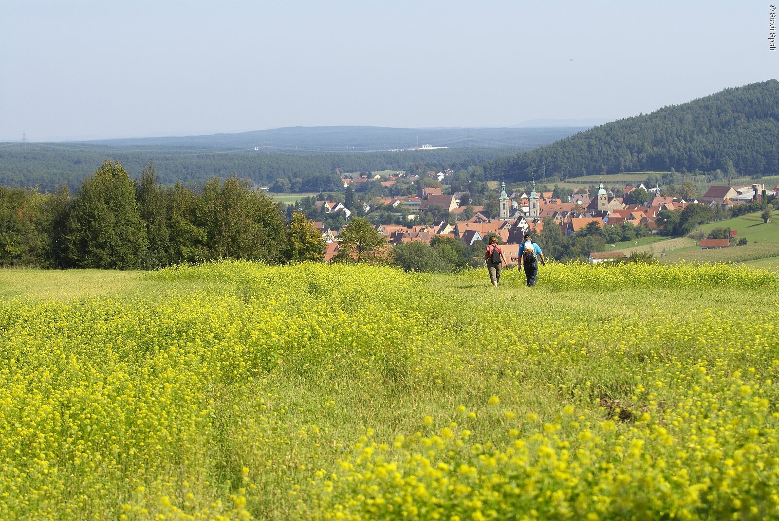 Spalt als Startpunkt dieser Etappe steht ganz im Zeichen von Bier und Hopfen. Auf mehr als 450 Jahre Brautradition blickt die Stadt zurück. Der Hopfen als wichtigster Rohstoff für das Bier gedeiht direkt vor der Haustür. Dieser „Spalter Aromahopfen“ genießt dank seines edlen Lupulingehalts einen hervorragenden Ruf und ist weltweit in zahlreichen Brauereien begehrt. Viel Wissenswertes rund um Hopfenanbau und Bier erfährt man im Museum „HopfenBierGut“. Kaum haben die Wanderer die hochgiebeligen Fachwerk- und Sandsteinhäuser von Spalt hinter sich gelassen, führt der Weg auch schon an den Spalter Hopfengärten vorbei und steigt dann steil im Wald hinauf nach Großweingarten. Das „Kirschendorf“ wird dieser Ort auch genannt, und wer im Frühling auf der Seenländer-Route unterwegs ist, genießt die weiße Pracht der Kirschblüte.